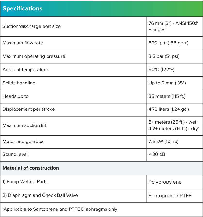 The 76 mm (3") Cognito Electric-Operated Double Diaphragm (EODD) Non-Metallic Pump is engineered to deliver exceptional performance for industrial operations. With a 3" port size, it offers high-flow capacity while maintaining the efficiency that Cognito products are known for. The repair in place maintenance design ensures your operations keep running efficiently with less down time.